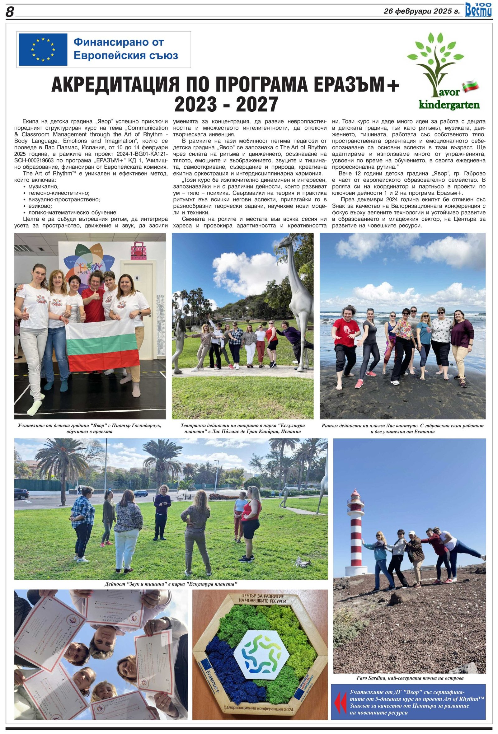 - Участие на петима учители от детската градина в структуриран курс обучение с тема "Communication & Classroom Management through the Art of Rhythm - Body Language, Emotions and Imagination", който се проведе в Лас Палмас, Испания, от 10 до 14 февруари 2025 година,