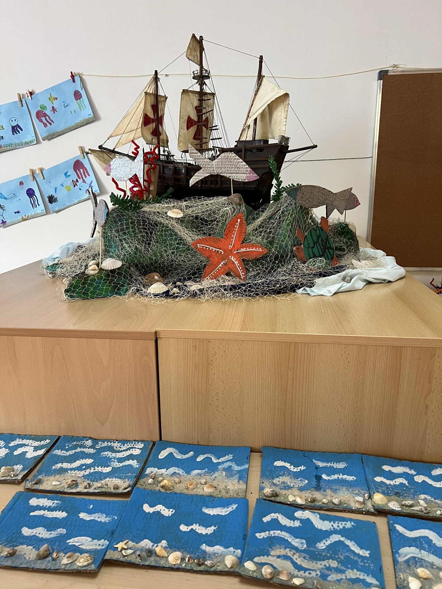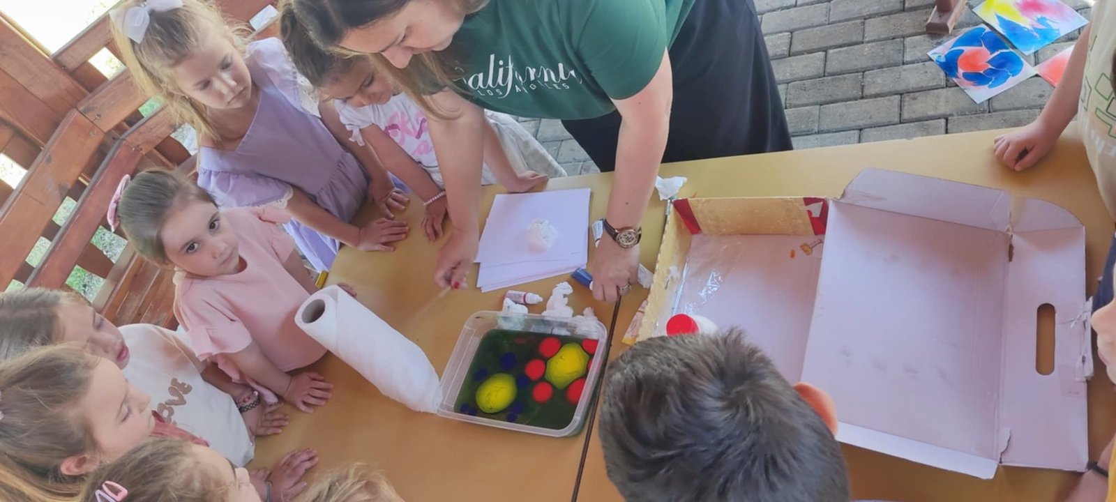 - Дейност 4: STEAM в детската градина – неформални дейости за включване на изкуството. Цел на дейността: Запознаване и въвеждане на техника Ебру /рисуване върху вода/ и ритъм карти „Дъга“ за стимулиране на креативното мислене, емоционално изразяване и развитие на творческите способности на детето чрез чрез езика на изобразителното изкуство и музиката /ритъма/.